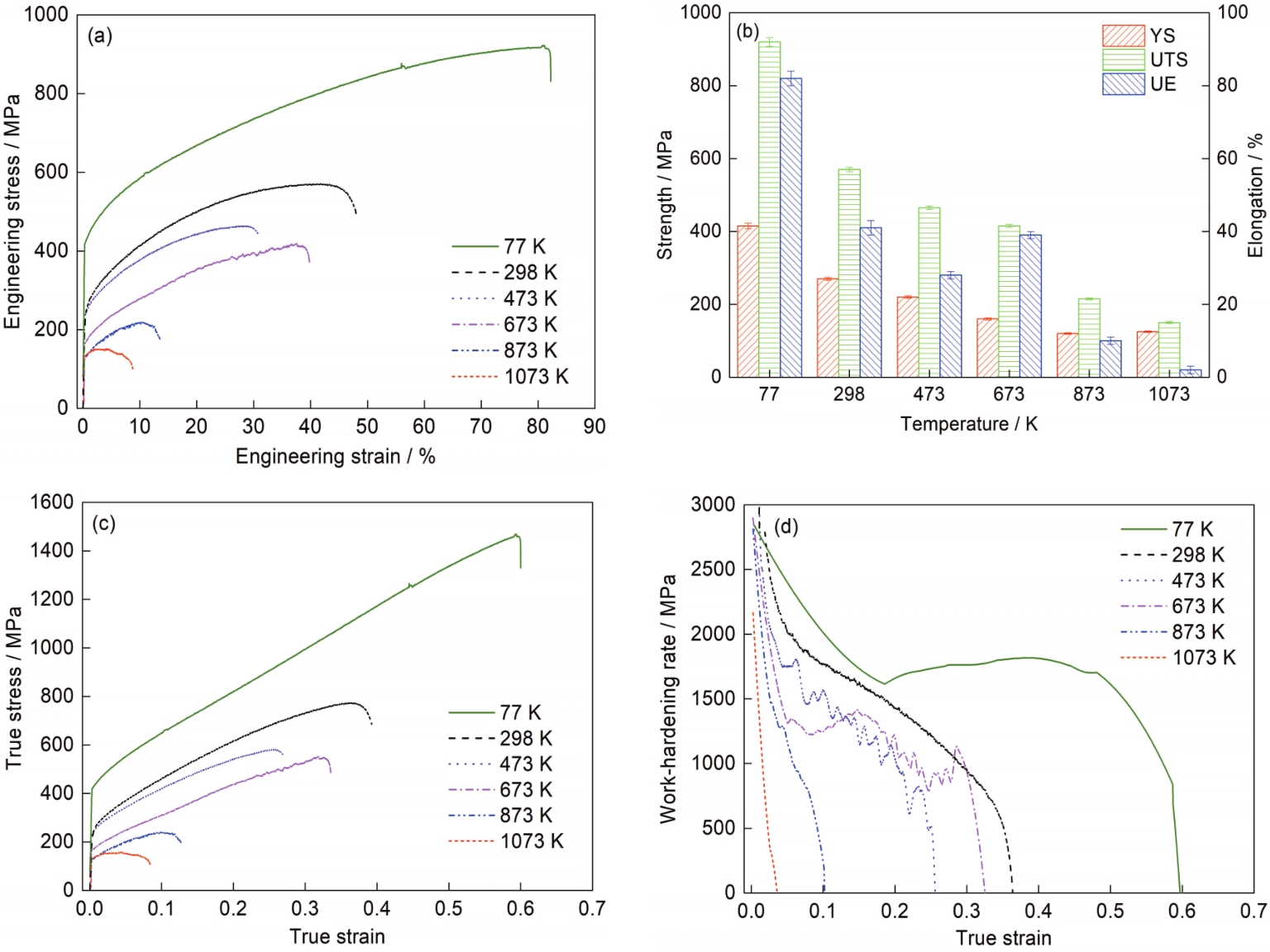 | Fig.3 Mechanical properties of CrFeNi MEA at different deformation temperatures and strain rate of 10-3 s-1 (a) quasi-static tensile engineering stress-strain curves (b) yield stress (YS), ultimate tensile strength (UTS), and uniform elongation (UE) (c) true stress-strain curves (d) corresponding work hardening rate-true strain curves |