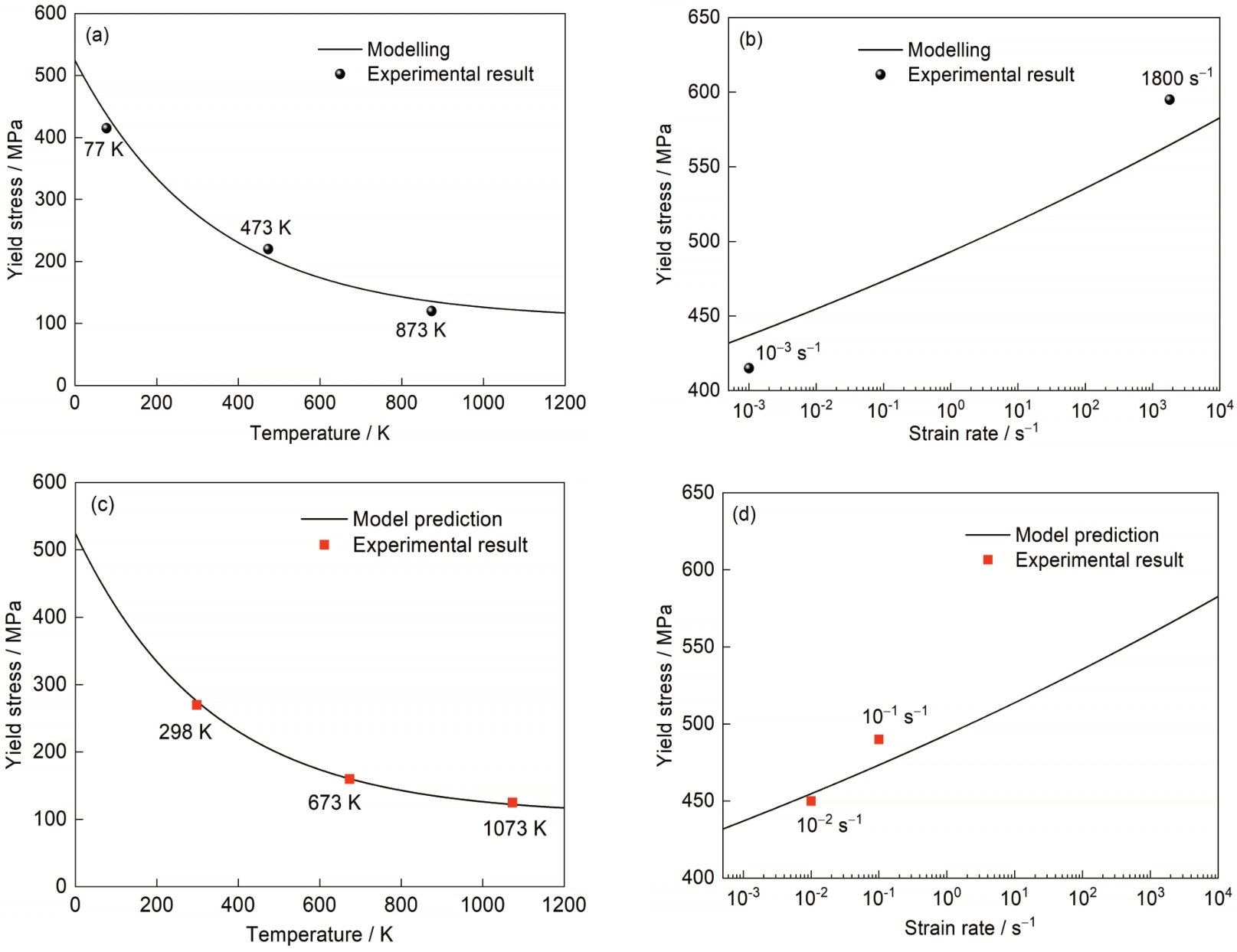 | Fig.5 Yield stresses, fitting curves, and comparisons between predicted results from ZA models and experimental results at different temperatures and strain rates (a) experimental yield stress and corresponding fit curve at 10-3 s-1 from ZA model (b) experimental yield stress and corresponding fit curve at 77 K from ZA model (c) comparisons between predicted results from ZA model and experimental results of yield stress at 10-3 s-1 (d) comparisons between predicted results from ZA model and experimental results of yield stress at 77 K |