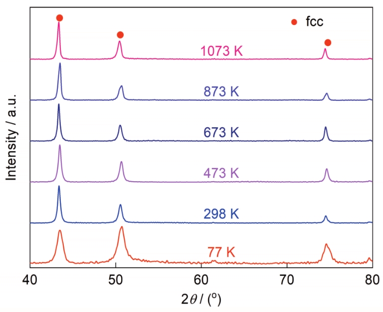 | 图6 不同温度拉伸断裂后CrFeNi中熵合金的XRD谱 |