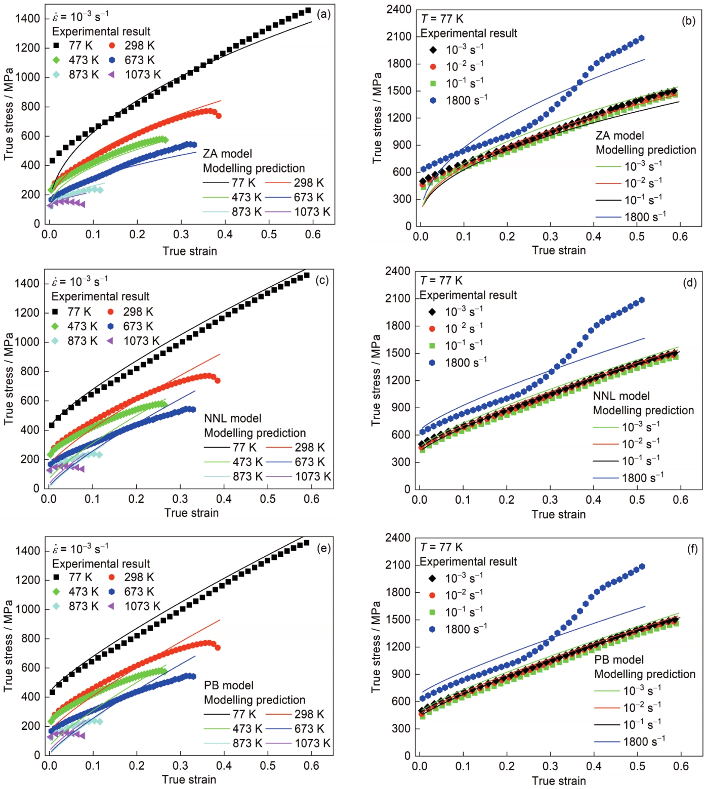 | 图9 准静态加载和低温加载下实验数据和基于物理基础的本构模型(ZA、NNL和PB模型)结果的对比 (a, b) ZA model (c, d) NNL model (e, f) PB model |