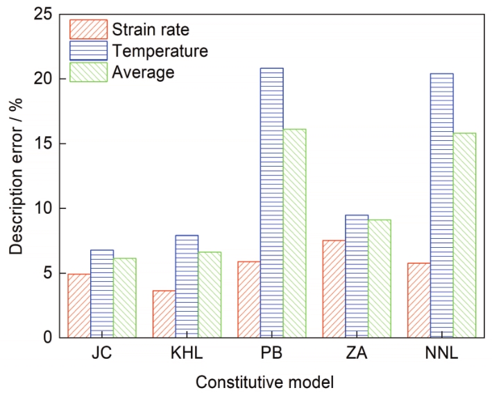 | Fig.10 Description errors of experimental data for each constitutive model (strain rate—description error of experimental data obtained at constant temperatures and different strain rates; temperature—description error of experimental data obtained at constant strain rates and different temperatures; average—description error of all experimental data) |