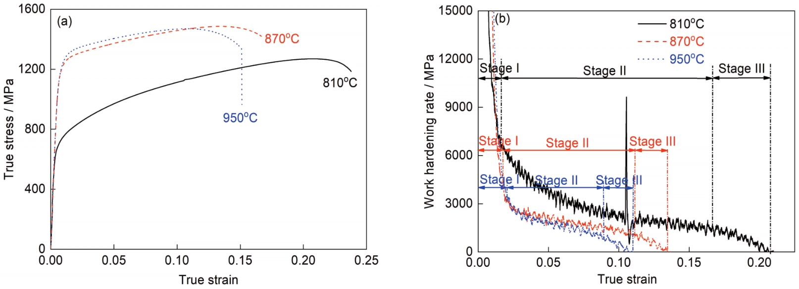 | 图9 奥氏体化温度为810、870和950℃下制备Q&P Si-Mn钢的真应力-真应变曲线和应变硬化率曲线 |