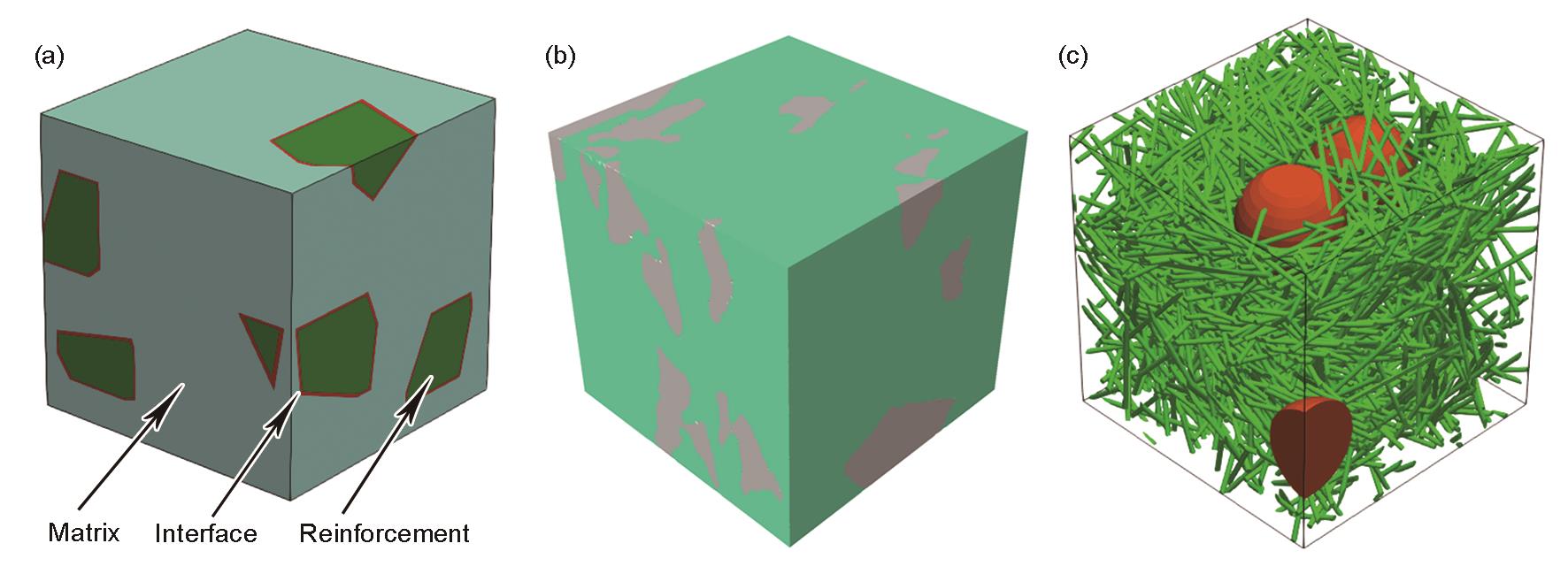 Fig.1 Typical representative volume element (RVE) models of aluminum matrix composite (a) RVE with interfacial layer structure (b) RVE model reconstructed by 3D nano-CT (c) ball-and-stick hybrid dense stack RVE model |