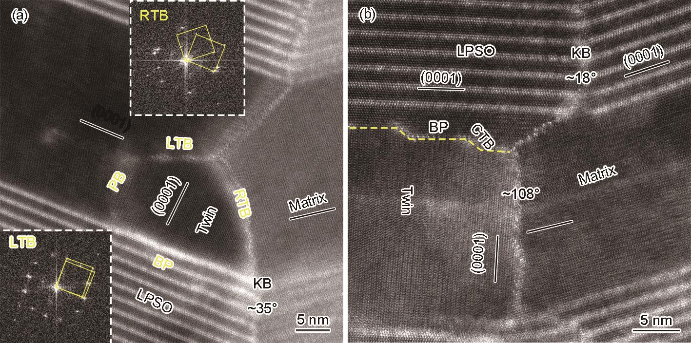 Fig.9 Atomic-resolution HAADF-STEM image of TB connecting with KB between LPSO structures, where the twinning just nucleated in the left side of the kink (a), and nearly occupied the left side of the kink (b) (LTB—left twin boundary, RTB—right twin boundary, CTB—coherent twin boundary) |