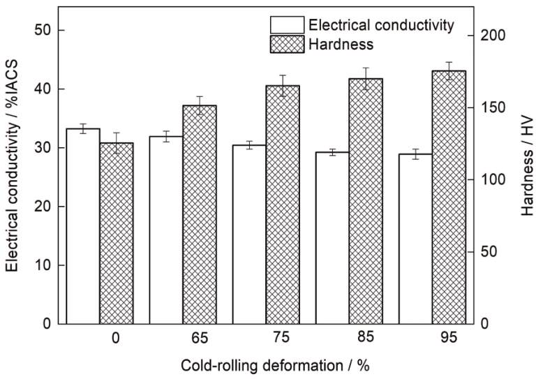 | 图3 不同程度冷轧变形对时效前合金导电率和硬度的影响 |