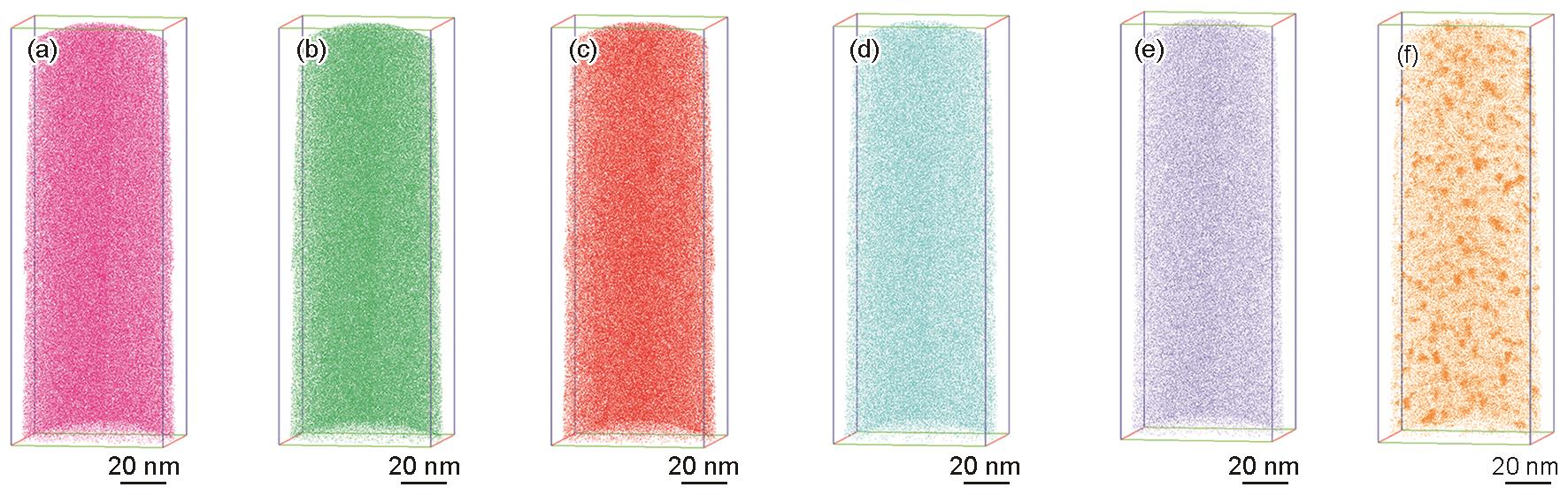 | Fig.4 APT characterizations of Fe (a), Ni (b), Mo (c), Cr (d), Co (e), and Cu (f) of the Cu-contained maraging stainless steel sample aged at 480oC for 0.5 h Color online |