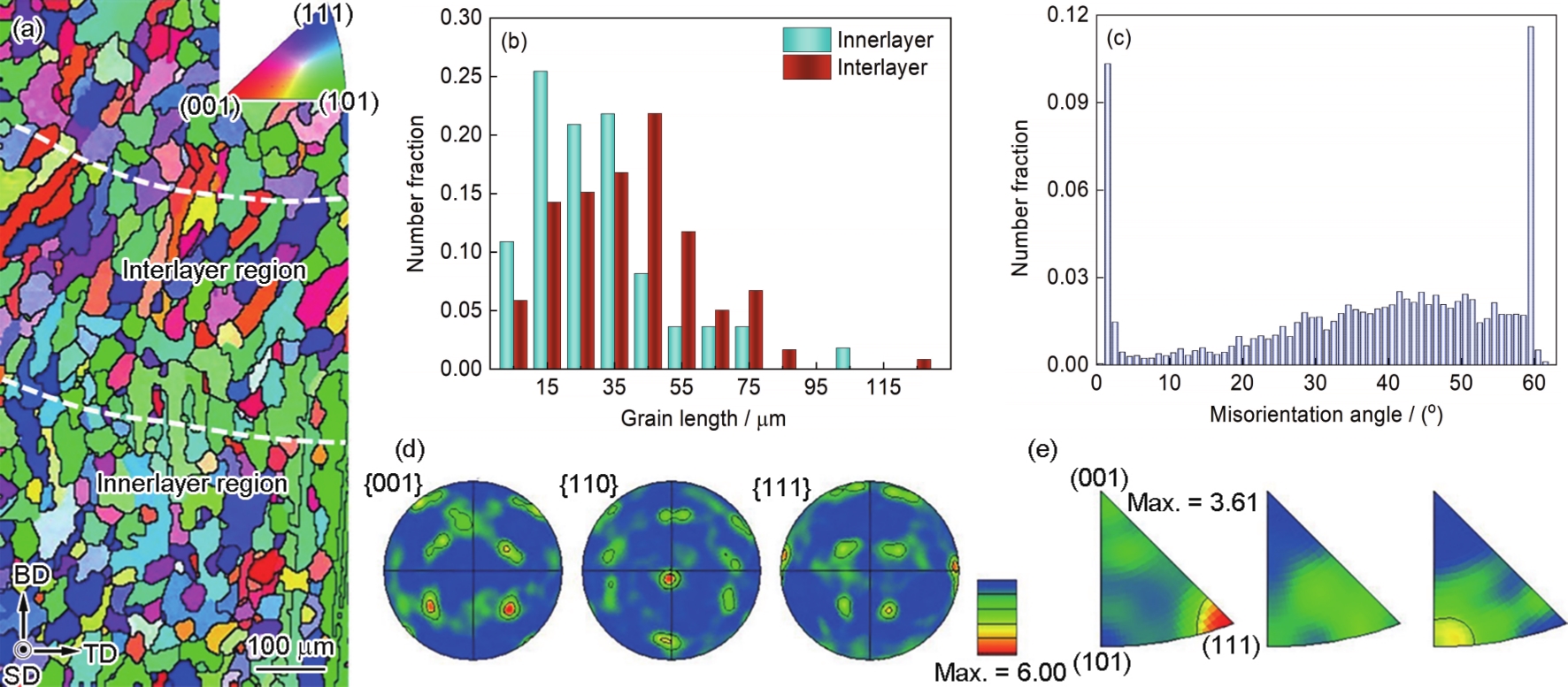 | 图3 2024铝合金WAAM成形试样的EBSD分析 (a) EBSD image of microstructure (BD—building direction, SD—scanning direction, TD—transverse direction) (b) distribution of grain size (c) distribution of grain boundary misorientation (d) pole figures (e) inverse pole figures (IPFs) |
