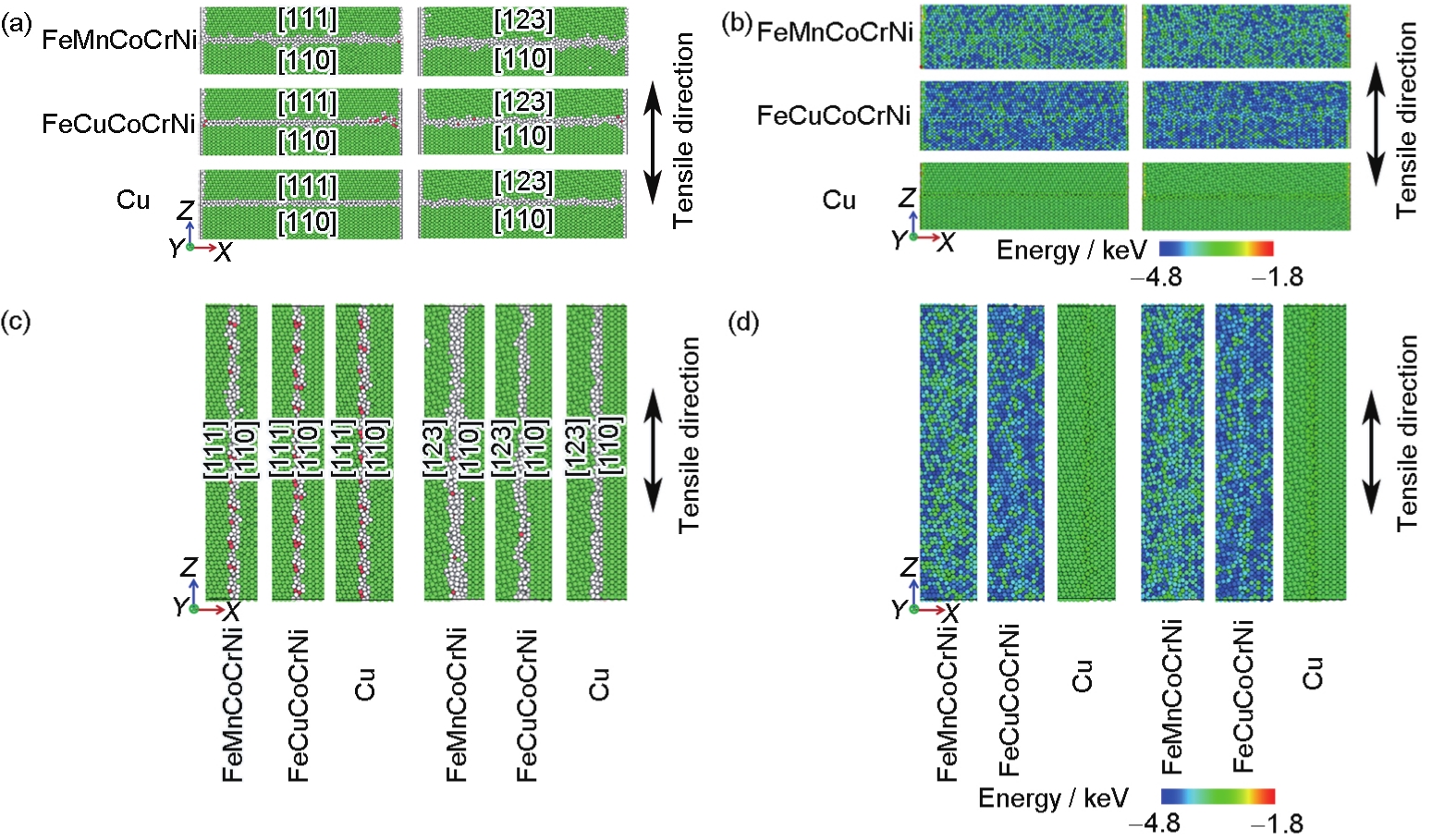 Fig.10 Atomic structures (a, c) and distributions of atomic potential energy (b, d) at grain boundaries for FeMnCoCrNi, FeMnCoCrNi, and pure Cu bicrystals when the grain boundary is perpendicular (a, b) and parallel (c, d) to the tensile direction |