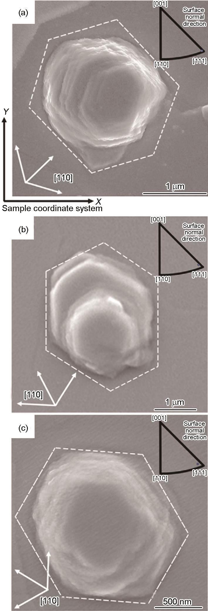 图3 不同晶粒取向[111]表面上的表面气泡形貌(具体晶粒取向已用[110]方向标出)[ |