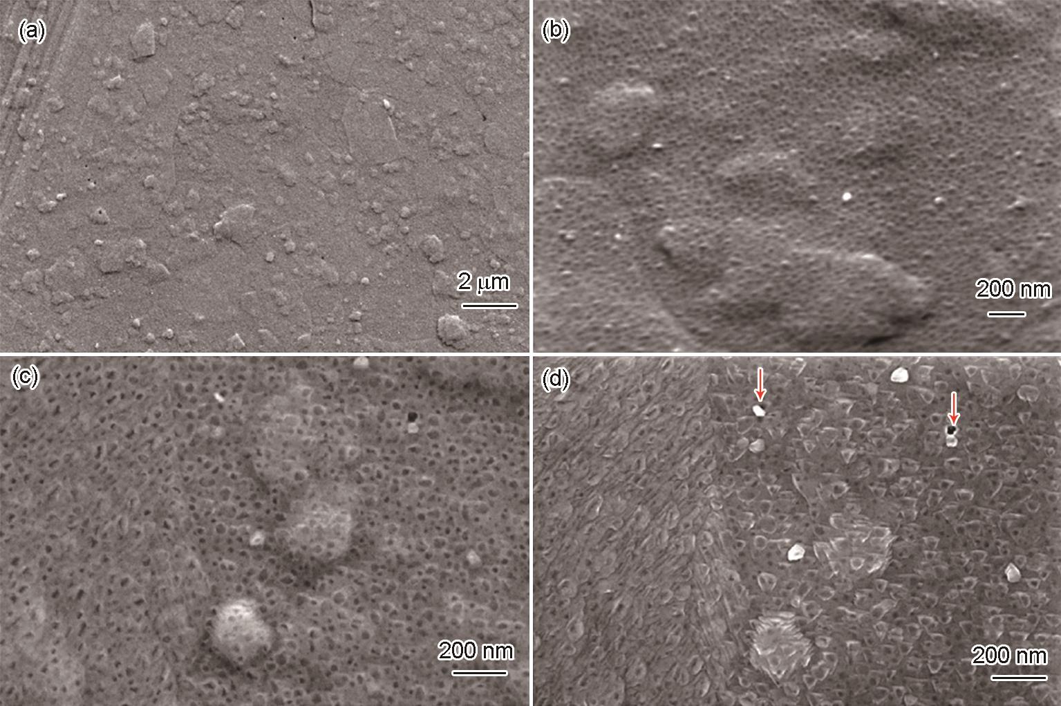 图5 D等离子体辐照后W的表面气泡和纳米泡(38 eV、1024 m-2·s-1、423 K、7 × 1026 m-2)[ |