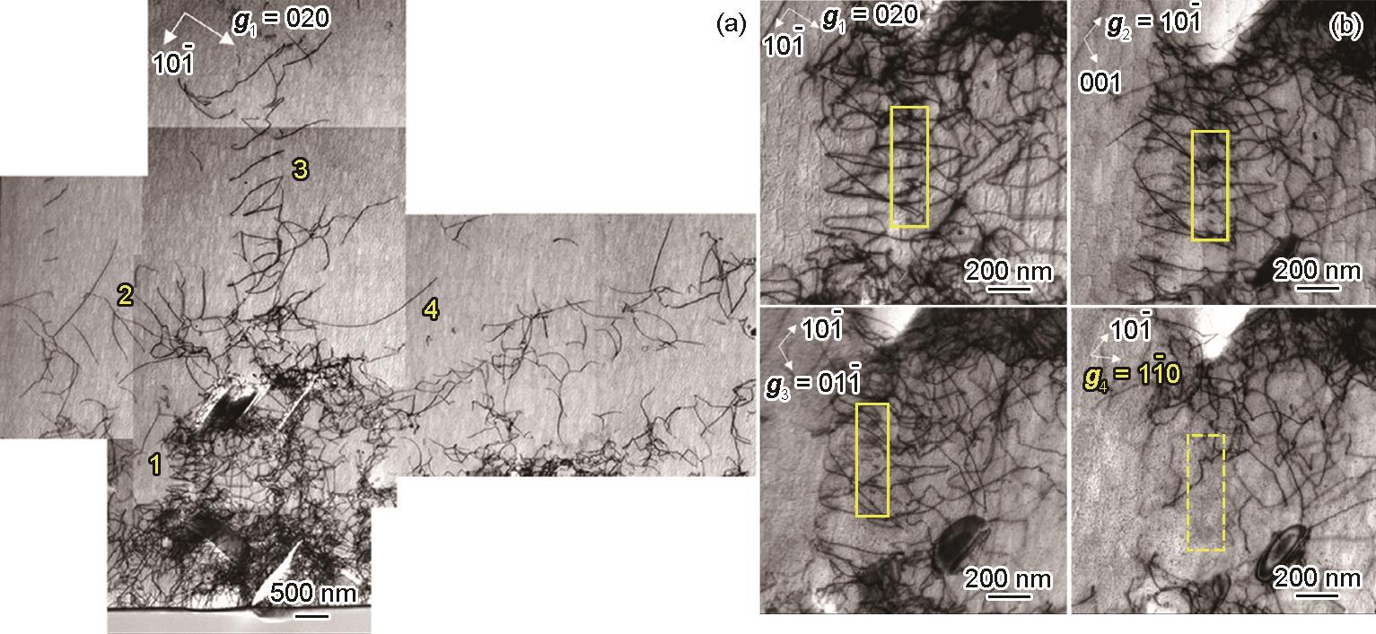 Fig.8 Typical morphologies of dislocations loops distributed around the blister in recrystallized W after exposed to H plasma[ (a) four dislocation loop arrays distributed near the intra-granular H blister (b) enlarge area 1 in Fig.8a, prismatic dislocation loops and “coffee-bean” loops distributed along [11 |