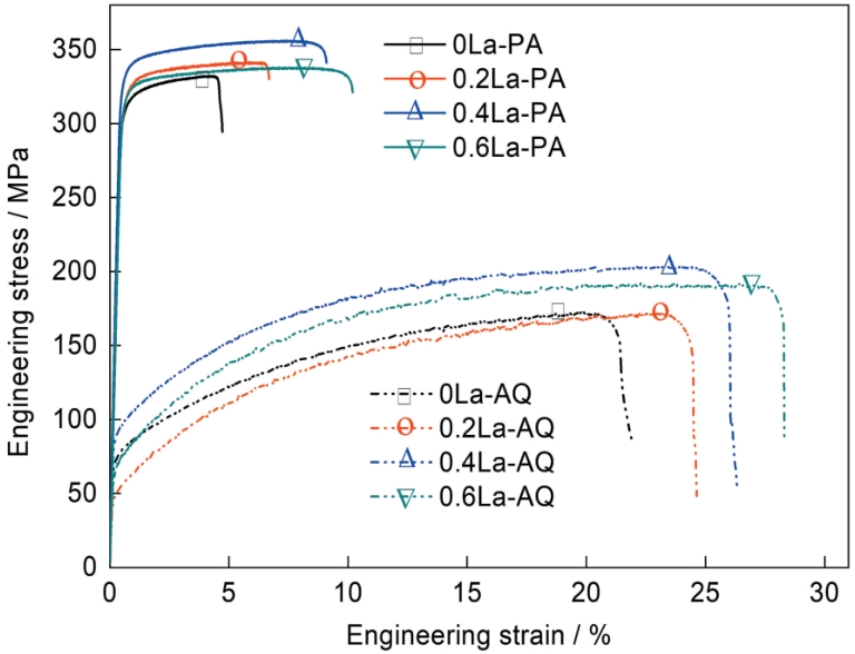 | 图2 4种合金淬火(AQ)态和峰值时效(PA)态的工程应力-应变曲线 |