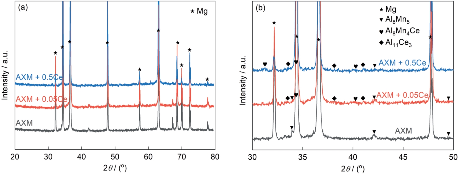| Fig.3 XRD spectra of the as-extruded AXM, AXM + 0.05Ce, and AXM + 0.5Ce alloy sheets (a), and partially enlarged XRD spectra (b) |