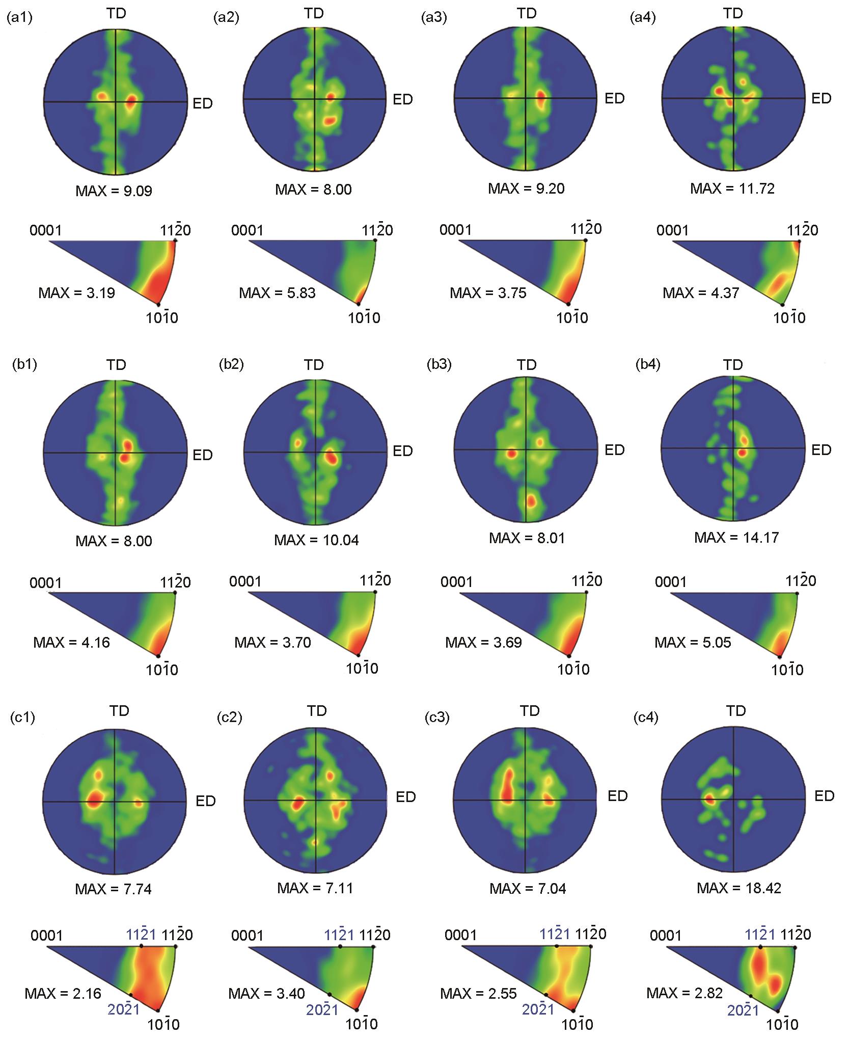 | Fig.8 (0002) PFs and corresponding IPFs along ED of grain size of the as-extruded AXM (a1-a4), AXM + 0.05Ce (b1-b4), and AXM + 0.5Ce (c1-c4) alloy sheets (a1-c1) all grains (a2-c2) grain size < 10 μm (a3-c3) grain size 10-25 μm (a4-c4) grain size > 25 μm |