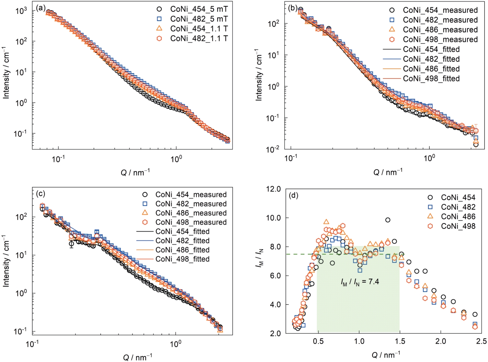 | Fig.7 SANS results of AerMet100 tempered steel under magnetic field application (a) total SANS 1D scattering data (b, c) experimental and fitted nuclear (b) and magnetic (c) SANS results (d) observed ratio between SANS nuclear scattering intensity (IN) and magnetic scattering intensity (IM) |