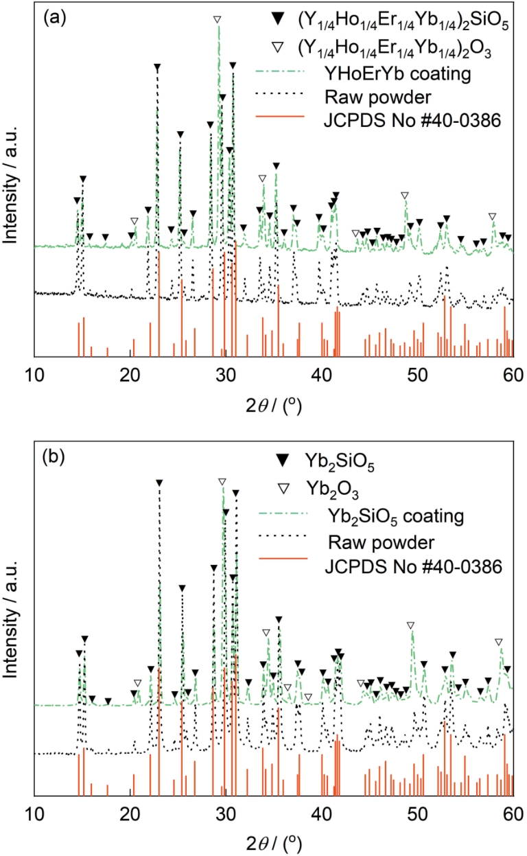 | Fig.2 XRD spectra of (Y1/4Ho1/4Er1/4Yb1/4)2SiO5/Yb2-Si2O7/Si (a) and Yb2SiO5/Yb2Si2O7/Si (b) coatings after annealing |