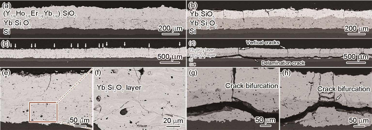| Fig.3 Cross-section SEM images of (Y1/4Ho1/4Er1/4Yb1/4)2SiO5/Yb2Si2O7/Si (a, c, e, f) and Yb2SiO5/Yb2Si2O7/Si (b, d, g, h) coatings after annealing (a, b) and thermal cycling for 300 cyc (c, e, f) and 83 cyc (d, g, h) (White arrows in Fig.2c indicate the locations of vertical cracks in top layer) |