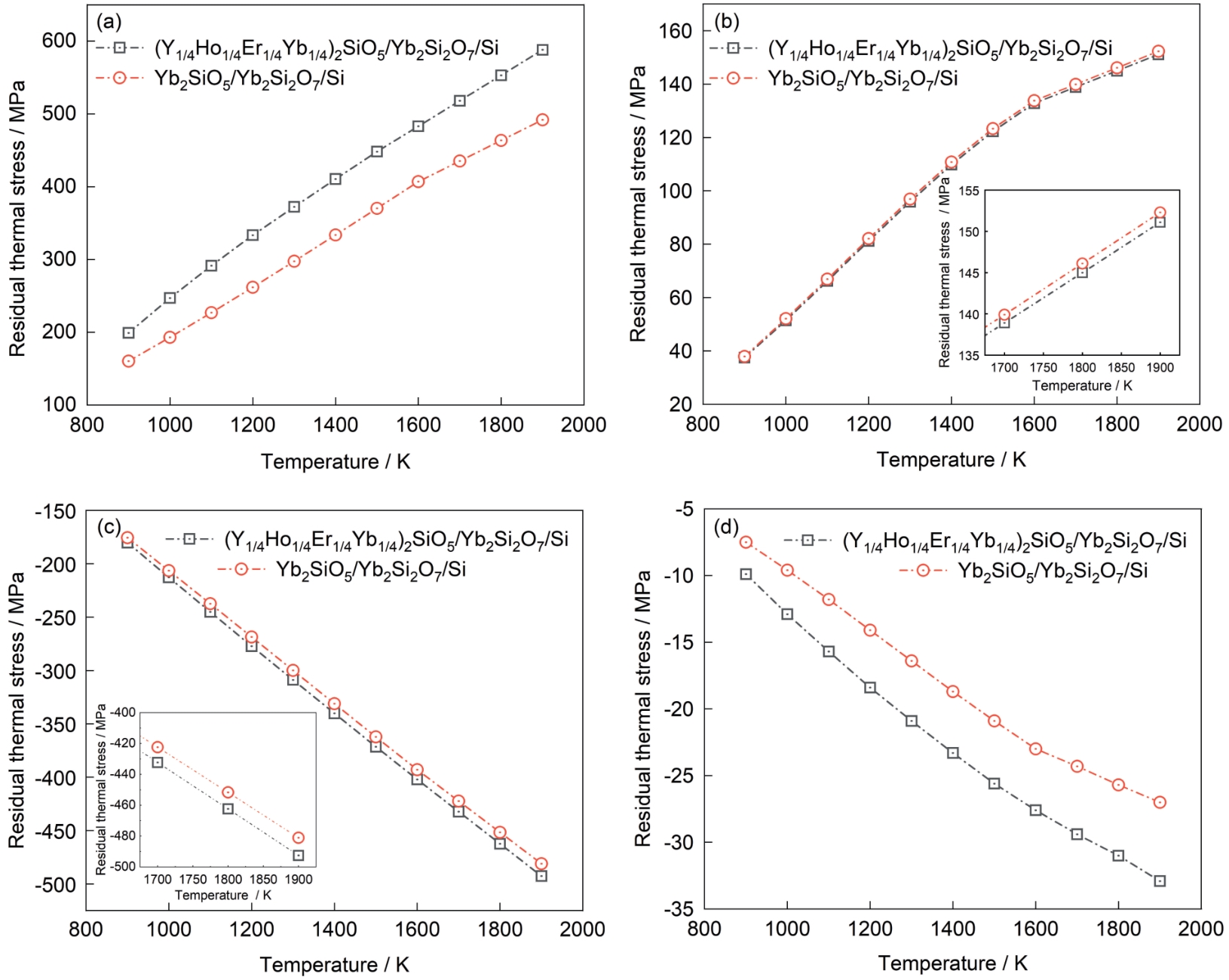 | Fig.4 Residual thermal stresses in different layers whiling cooling from different temperatures to room temperature of (Y1/4Ho1/4Er1/4Yb1/4)2SiO5/Yb2Si2O7/Si and Yb2SiO5/Yb2Si2O7/Si coatings (Insets in Figs.4b and c show the enlarged details of residual thermal stress in inter layer and bond layer in the range of 1700 K to 1900 K) (a) top layer (b) inter layer (c) bond layer (d) substrate |