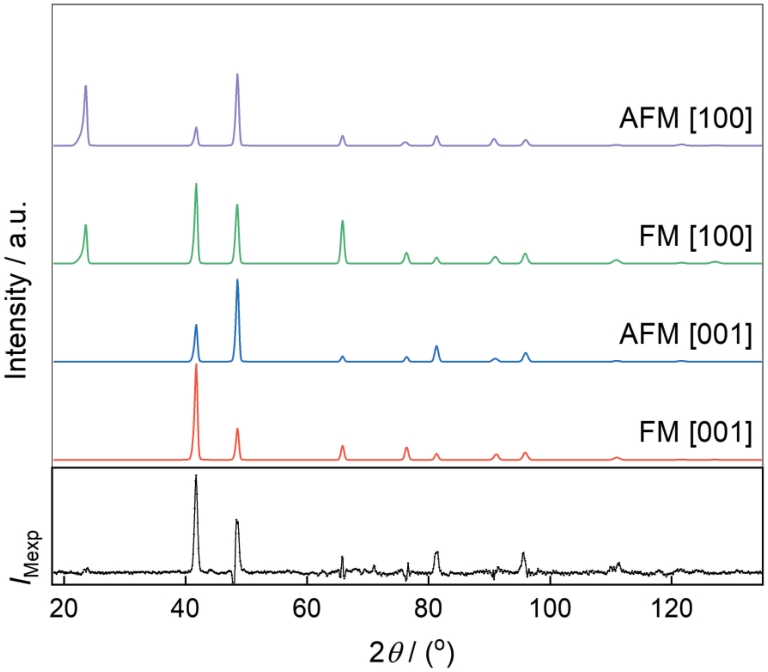 | Fig.4 Cr5Te8 experimental magnetic contribution and four magnetic-structure models (FM and AFM stand for ferromagnetic and antiferromagnetic order, respectively; IMexp is the experimental intensity of magnetic diffraction) |
