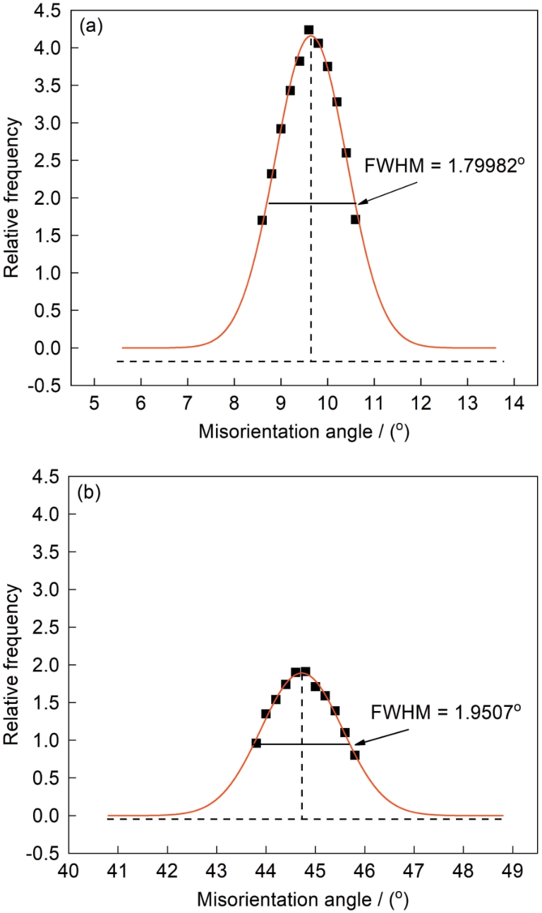 | Fig.6 Weighted Gaussian misorientation distribution curves of two grain boundary groups containing {111}/{111}-NSBs in the sample C (FWHM—full width half maximum) (a) <111>/10° (b) <111>/45° |