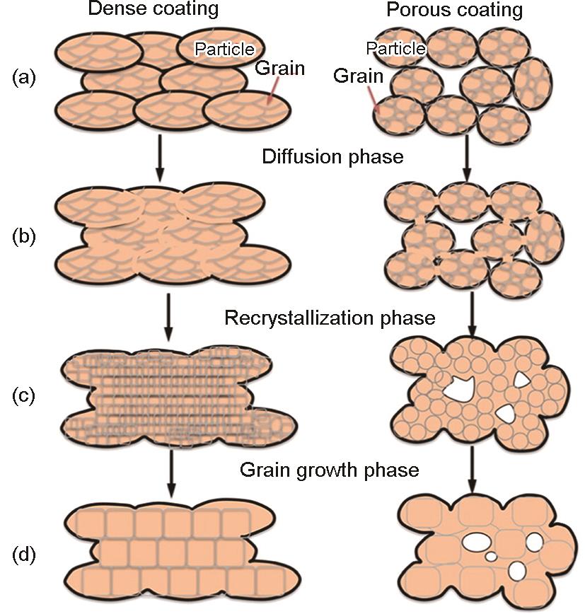 | 图 1 热处理过程中致密和多孔冷喷涂涂层结构转变示意图[ |