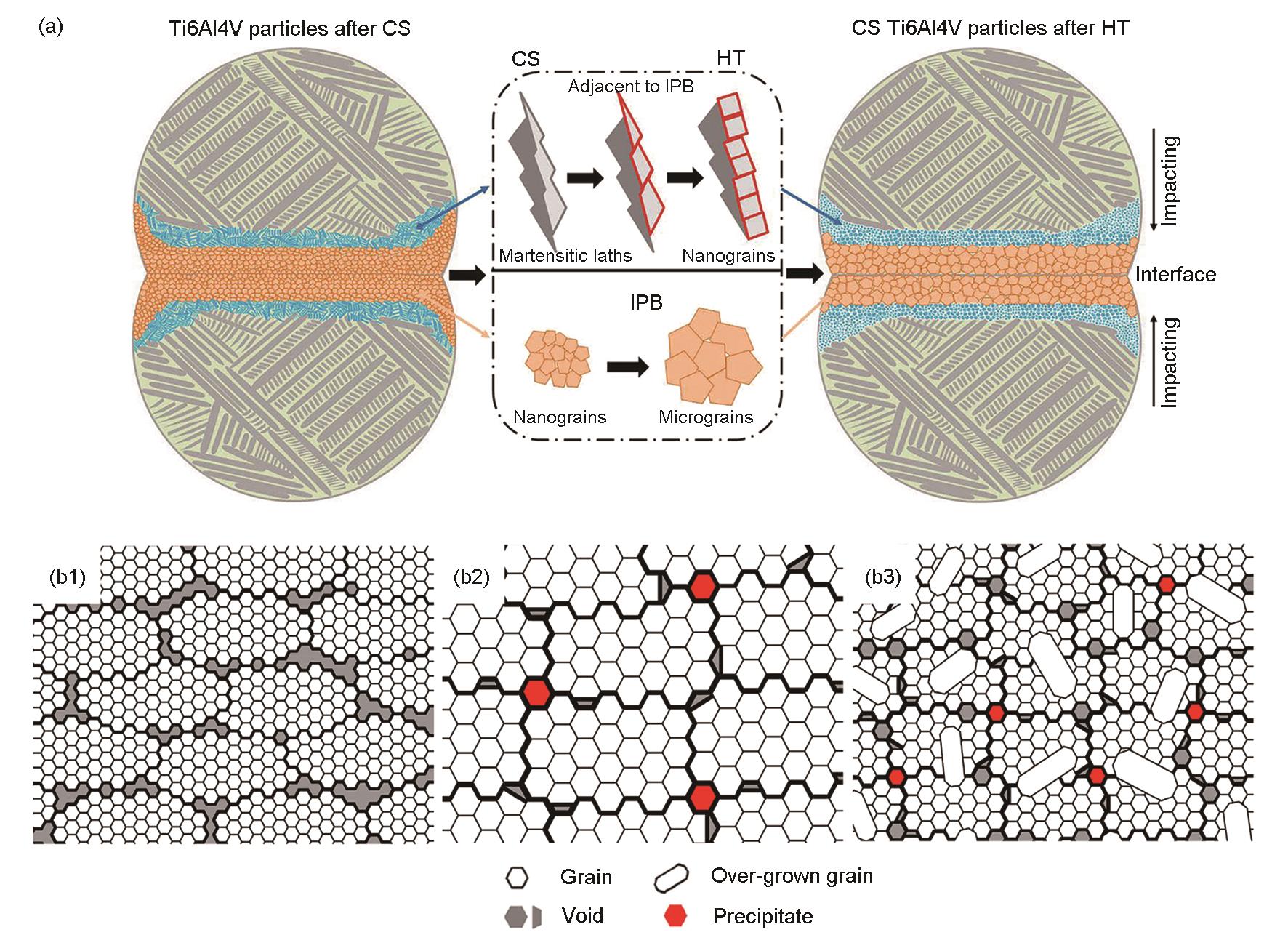 | Fig.2 Schematics of microstructure evolution of deformed Ti6Al4V particles in cold spray (CS) deposition coating during high temperature heat treatment (HT) (IPB—inter-particle bonding)[ (b1) grains in as-sprayed copper coating (b2) uniformly grown grains after optimal annealing (b3) abnormally grown grains over optimal annealing temperature |