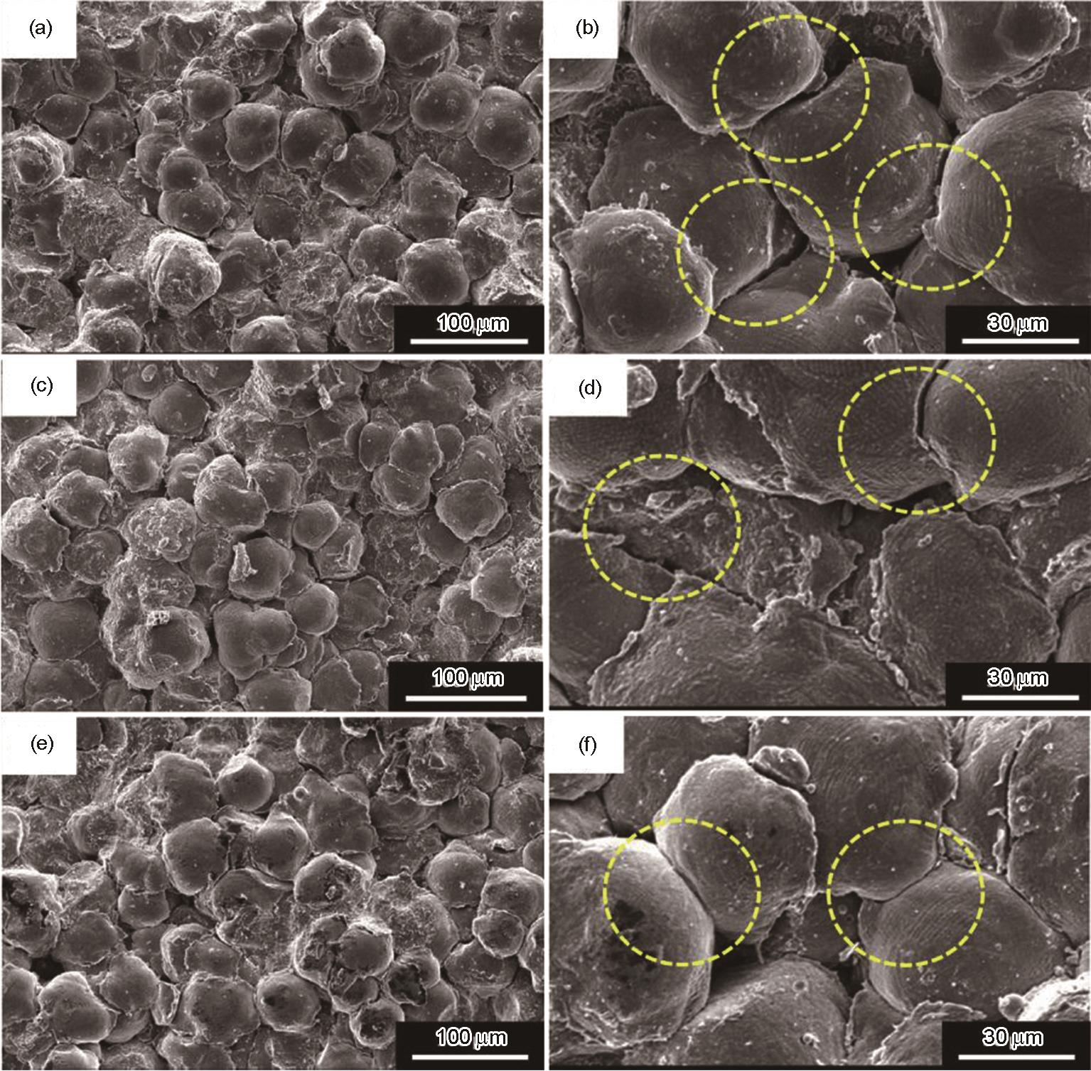 | Fig.5 Low (a, c, e) and high (b, d, f) magnified SEM images showing surface morphologies of IN718 coating under different post-treatment processes[ (a, b) cold spraying (c, d) heat treatment (e, f) induction remelting |