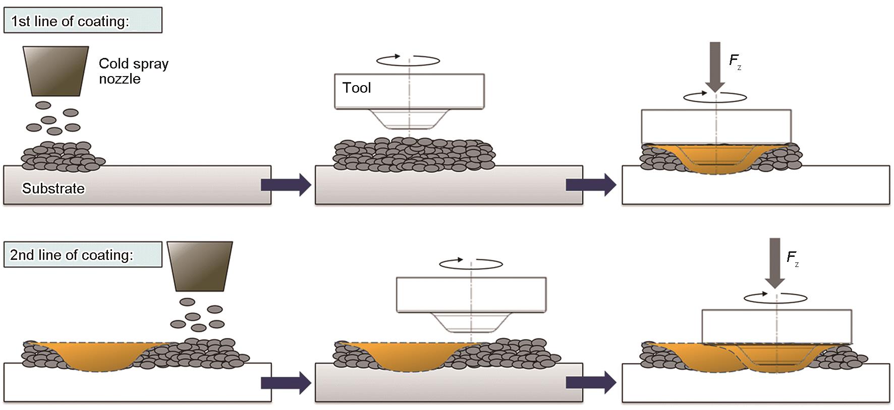 | 图9 连续搅拌摩擦(FSP)处理过程中渐进涂层沉积的示意图[ |