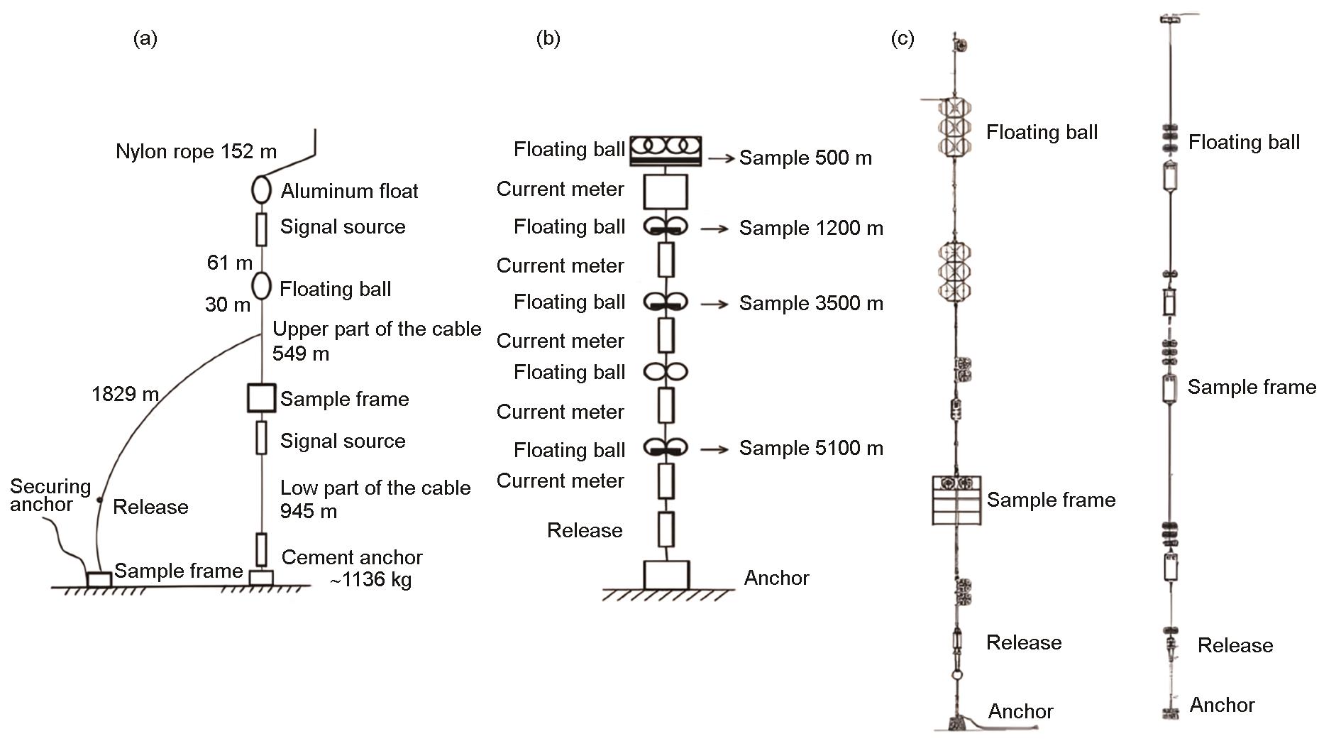 | Fig.2 Schematic of testing equipment in real deep-sea environment[ (a) submersible testing system on seabed (b) bunch style testing system (c) novel deep-sea environmental testing system: suspension style testing system (the left); efficient bunch style testing system (the right) |