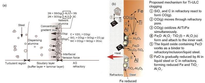 Lee等[44]在1833 K下使用CO气体(0.5 L/min)喷吹钢液表面30 min,用来模拟含Ti铝镇静钢在浇注过程中水口材料发生碳热反应产生的CO对钢液二次氧化行为的影响,反应机理如图4b[44]所示。在浇注含Ti铝脱氧超低碳钢时,水口耐火材料发生碳热反应生成的CO (反应(7))扩散至钢液与耐火材料界面,CO与钢液中Al、Ti和Fe同时反应,生成液态Fet O-Al2O3-TiOx (反应(9))和固态Al2O3夹杂物(反应(8))并附着在水口耐火材料内壁,液态Fet O-Al2O3-TiOx 中的Fet O被钢液中的Al或者水口耐火材料中的C还原,最终水口耐火材料的沉积物转变为还原的Fe液滴和Al2O3-TiOx 复合氧化物[44]。Lee和Kang[45]还报道了当水口耐火材料中含有CaO、ZrO2和SiO2时,它们会较快地溶解进生成的Fet O-Al2O3-TiOx 液态沉积物中,最终转变为Fe液滴和CaO-Al2O3-TiOx -ZrO2-SiO2水口沉积物。