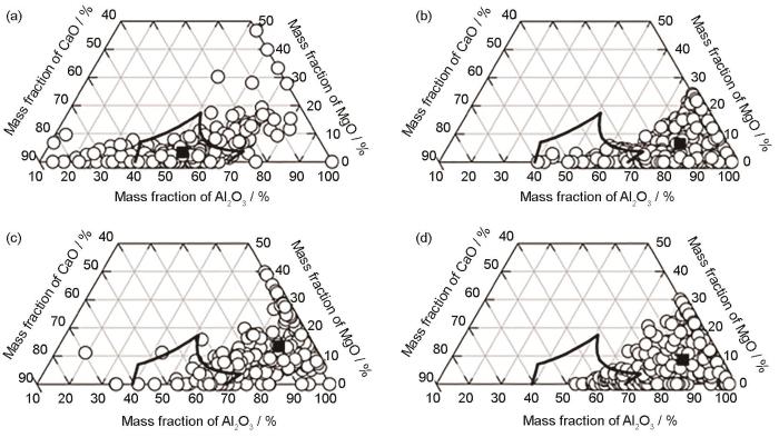 钢液的二次氧化不仅会造成钢液成分的波动,还会造成钢中非金属夹杂物形貌、成分和数量密度的变化。Yang等[60]在调研铝脱氧钙处理API-X70管线钢的连铸过程时发现,当连铸至70 t时,钢液吸气造成钢液的二次氧化,钢液T.O含量和N含量分别从RH炉(Ruhrstahl-Heraeus degasser)出站后的14 × 10-6和31 × 10-6增加至21 × 10-6和35 × 10-6。钢液二次氧化的夹杂物成分的变化如图6[60]所示。可以看出,经过钙处理后钢中夹杂物主要成分为液态钙铝酸盐(CaO / Al2O3含量比值 = 0.86),但是钢液发生二次氧化后中间包钢液夹杂物则转变为固态钙铝酸盐CaO·2Al2O3和CaO·6Al2O3 (CaO / Al2O3含量比值 = 0.16)。由于富Al2O3的钙铝酸盐夹杂物与钢液有较强的界面能[61],因此与纯Al2O3夹杂物相比,CaO·2Al2O3和CaO·6Al2O3夹杂物更容易碰撞聚集形成较大颗粒的夹杂物,将会造成严重的水口结瘤[62,63]。诸多学者[64~67]也都报道了类似的结果,并发现铝脱氧钙处理钢发生二次氧化后,钢中夹杂物类型的转变同时受钢中S和Ca含量的影响。当钢中总钙(T.Ca)含量为10 × 10-6时,夹杂物的转变行为为CaS→液态夹杂物→CaO·2Al2O3→CaO·6Al2O3→Al2O3;而当钢中T.Ca = 30 × 10-6时,钢中CaS夹杂物全部通过反应(12)和(13)[68]分解并转变为固态钙铝酸盐夹杂物(CaO·2Al2O3 + CaO·6Al2O3)。