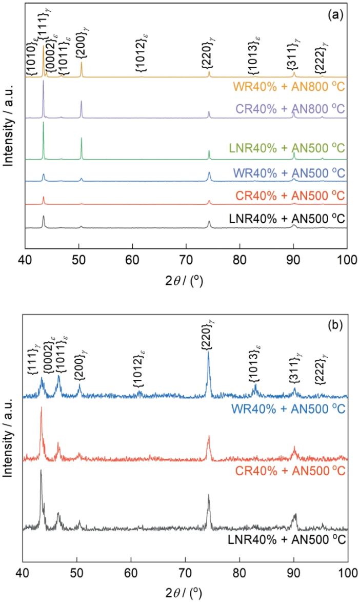 XRD spectra of samples prepared by rolling and annealing before (a) and after (b) tensile tests (LNR—liquid nitrogen rolling, CR—cold rolling at room temperature, WR—warm rolling, AN—annealing)