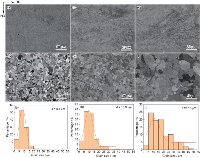 SEM images (a-f) and grain size distribution maps (g-i) of the samples prepared by different processing routes (d—average grain size, RD—rolling direction, ND—normal direction )