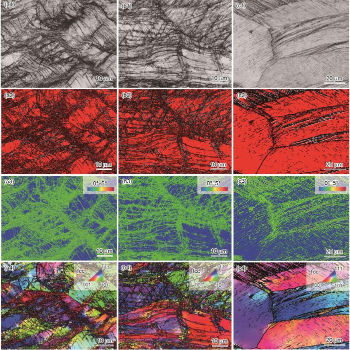 (a1-c1) band contrast maps (a2-c2) phase distribution maps (High-angle boundaries with misorientation angles larger than 10° are indicated by black solid lines, low-angle boundaries with misorientation angles between 3° and 10° are indicated by thin black solid lines, and Σ3 twin boundaries in the fcc phase are indicated by white solid lines) (a3-c3) kernel average misorientation maps (a4-c4) inverse pole figures parallel to the tensile axis