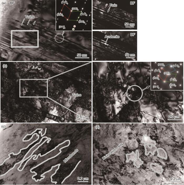 TEM images and the selected area electron diffraction (SAED) patterns (insets) of the LNR40% + AN500 oC sample showing deformation twins (a), twin intersection (b), microbands (c), and dislocation cells (d) (T—twin, BF—bright field, DF—dark field)