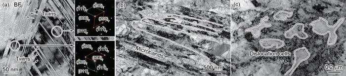 TEM images and the SAED patterns (insets) of the CR40% + AN500 oC sample showing deformation twins with different directions (a), microbands (b), and dislocation cells (c)