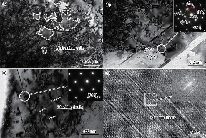 TEM images and the SAED patterns (insets) of the WR40% + AN500 oC sample showing dislocation cells (a), deformation twins (b), and stacking faults (c); high-resolution TEM (HRTEM) image and fast Fourier transform (FFT) (inset) pattern of stacking faults (d)