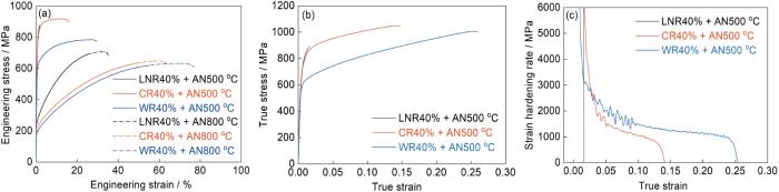 Engineering stress-strain curves (a), true stress-strain curves (b), and strain hardening rate curves (c) of the samples prepared by different processing routes
