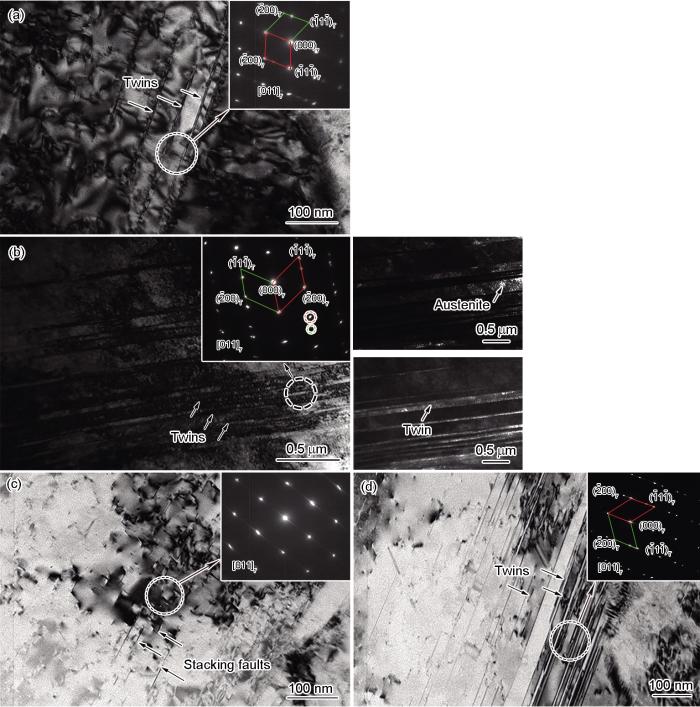 (a, b) deformation twins in the CR40% + AN500 oC sample (The right figures in Fig.10b are the corresponding dark-field TEM images) (c, d) stacking faults (c) and deformation twins (d) in the WR40% + AN500 oC sample and corresponding SAED patterns (insets)