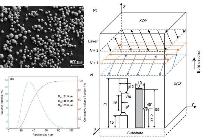 Morphology of 18Ni300 maraging steel powder (a), powder particle size distribution (D10, D50, and D90 are the particle sizes of the powder at 10%, 50%, and 90% cumulative distribution, respectively) (b), and schematics of tensile specimen dimensions, impact specimen dimensions, and the scanning strategy employed during selective laser melting (SLM) process (unit: mm) (c)