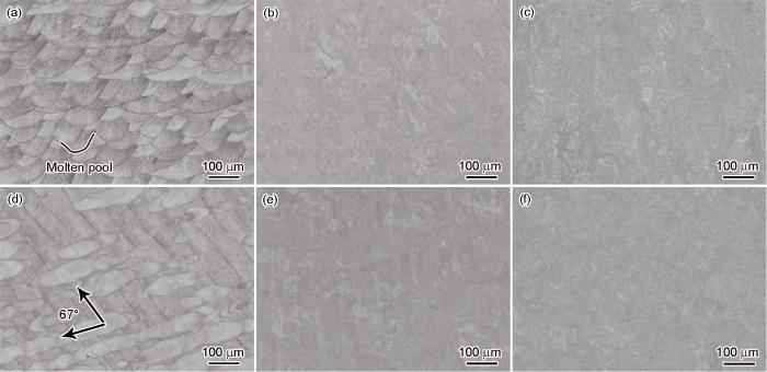 OM images of SLM 18Ni300 samples after different heat treatments (a-c) XOZ surface images of AB (a), DA (b), and SA (c) samples (d-f) XOY surface images of AB (d), DA (e), and SA (f) samples