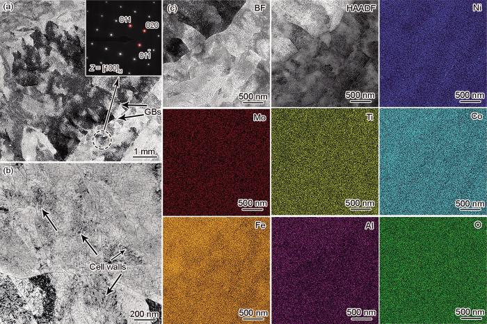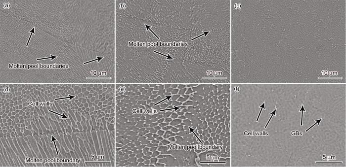 胞状组织在增材制造中广泛存在,这是由于激光加工的超高冷却速率所造成的微观组织形貌[25]。通常认为,胞状组织是由位错缠结形成的,位错的来源一般认为是激光加工过程中的重复加热导致已凝固部分再次受热发生膨胀而引起的塑性变形[26,27]。如图4a和d所示,胞状组织呈胞状或柱状形貌,其形态演变主要由温度梯度(G)与凝固速率(R)之比(G / R)决定[9],G / R越大,越倾向于形成柱状晶,且柱状晶的生长方向为主要热流方向[26];G / R越小,越倾向于形成胞状晶。熔池底部的热输入较小,G最大,而R接近于0,G / R较大,组织为柱状晶;热输入从熔池底部开始上升,R逐渐增大,G逐渐减小,G / R逐渐减小,由柱状晶逐渐向胞状晶演变。由于高能激光束和小尺寸的熔池,SLM存在远大于熔池尺寸的热影响区,复杂的热流使胞状组织的形态分布更加复杂[27]。胞状组织可以作为软屏障阻碍位错的运动,提高强度,同时可以促进加载过程中的塑性流动,从而提高塑性,还可以作为溶质元素偏聚的优先位置[27]。如图4e和f所示,经过热处理后胞状组织发生不同程度的溶解,使其呈现不连续的形貌,胞状组织的溶解主要通过位错的迁移和湮灭实现[16],胞状组织减少会对材料的强度和延展性产生不利影响[14,26]。