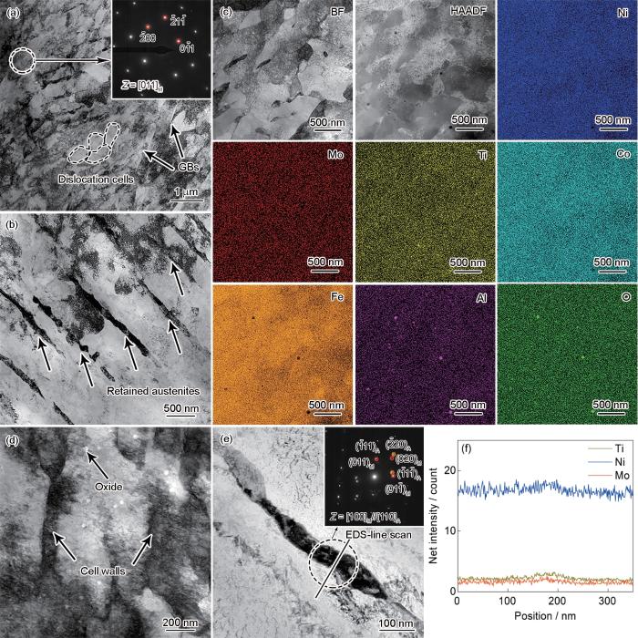 图8为SA试样的TEM表征结果。如图8a所示,SA试样主要为马氏体组织,没有明显的奥氏体组织,存在少量胞壁(图8b),残留的胞壁仍然由位错缠结组成。EDS分析结果如图8c所示,SA试样存在少量Ni或Mo的富集区域。如图9a所示,SA试样在部分马氏体晶界处存在厚度约50 nm、长度约200 nm的逆转奥氏体。该区域的EDS结果(图9b)表明,晶界存在明显的Ni、Ti和Mo的富集,Fe和Co含量则较少。而逆转奥氏体区域存在Ni富集,其他元素分布均匀,对该区域进行高分辨TEM (HRTEM)分析,结果如图9c和f所示。由于析出相的影响,其快速Fourier变换(FFT)结果较为复杂,如图9d和e所示。可见,该区域存在与马氏体基体呈现N-W取向关系的奥氏体。