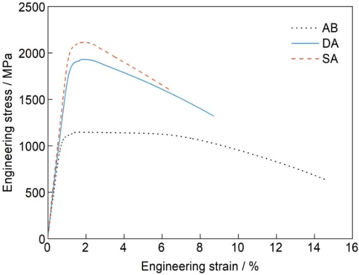 图12为不同状态18Ni300试样的工程应力-应变曲线,具体数值如表1所示。AB试样的强度最低,屈服强度为(1090 ± 1.5) MPa,抗拉强度为(1147 ± 1.5) MPa,断后伸长率为14.5% ± 1.4%,塑性最好,硬度为(36.6 ± 0.6) HRC。SA试样的强度最高,屈服强度为(2059 ± 9.9) MPa,抗拉强度为(2114 ± 9.0) MPa,断后伸长率为6.0% ± 1.4%,塑性最低,硬度为(54.7 ± 0.4) HRC。DA试样的强度较SA试样的低,屈服强度为(1854 ± 13.2) MPa,抗拉强度为(1931 ± 8.1) MPa,断后伸长率为8.5% ± 1.0%,塑性较好,硬度为(52.3 ± 0.3) HRC。DA和SA试样的Charpy冲击实验结果表明,DA试样的冲击吸收功为(18.3 ± 0.6) J,SA试样的冲击吸收功为(17.3 ± 0.6) J,可见DA试样具有较高的冲击韧性。