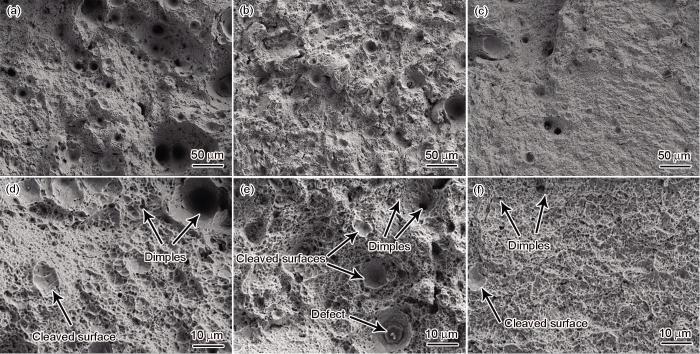 Low (a-c) and high (d-f) magnified SEM images of tensile fractures of SLM 18Ni300 samples after different heat treatments (a, d) AB (b, e) DA (c, f) SA