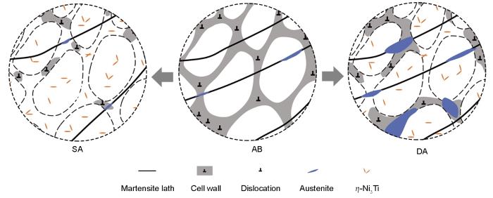 根据前文分析可知,AB试样存在许多连续胞状和柱状的组织,胞壁上具有较高密度的位错,胞内具有较低的位错密度,部分晶界处存在少量残余奥氏体。DA试样的胞状组织部分溶解,胞壁不再连续,残留的胞壁仍然由位错组成。部分晶界和残留的胞壁处有逆转奥氏体生成,奥氏体含量上升,基体存在高密度的Ni3Ti析出相。SA试样的胞状组织基本溶解,存在少量胞壁残留,残留的胞壁仍然由位错组成,晶粒尺寸增大,部分晶界处存在微量逆转奥氏体,基体存在高密度的Ni3Ti析出相。不同状态18Ni300试样的微观组织演变如图14所示。