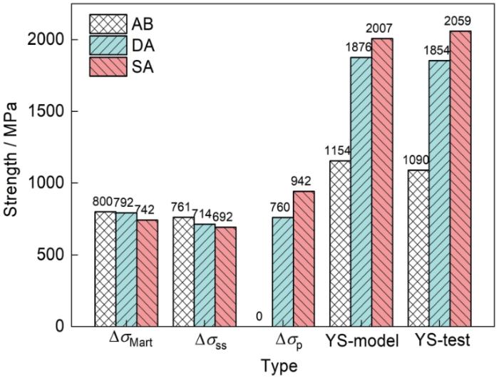 Estimated and experimental results of yield strength of SLM 18Ni300 samples after heat treatments (ΔσMart—phase transformation streng-thening, Δσss—solid solution strengthening, Δσp—precipitation strengthening)