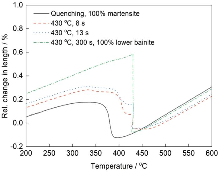 图1反映了在淬火和等温淬火过程中棒状试样的相对长度变化。其中,根据淬火形成的100%马氏体试样的长度变化曲线可知,实验材料的Ms为420 ℃,则等温淬火过程中的保温温度设为430 ℃ (等温淬火试样分别记为IT430 ℃ + 8 s、IT430 ℃ + 13 s和IT430 ℃ + 300 s)。试样在600 ℃冷却至430 ℃过程中仅发生线性收缩,无其他相变反应,430 ℃等温保温过程中由过冷奥氏体相变形成下贝氏体,试样相变膨胀。下贝氏体铁素体是由过冷奥氏体晶格位移切变形成,而下贝氏体碳化物则是由合金原子扩散形成[18],因此,在给定的等温温度下,试样的长度膨胀量(也代表下贝氏体体积分数,VLB)与保温时间息息相关。通过对金相组织进行检测可知,IT430 ℃ + 300 s试样中可形成100%下贝氏体组织,此时,下贝氏体相变膨胀量达到最大。基于此,根据