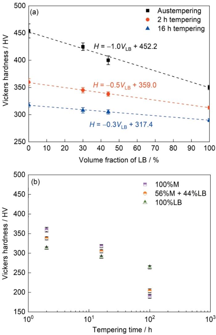 Hardness (H) variations against the volume fraction of lower bainite (LB) in the lower bainite/martensite (LB/M) microstructures on tempering at 600 oC up to 16 h (a), and hardness variations in the singular martensite (100%M), LB/M (56%M + 44%LB), and singular lower bainite (100%LB) microstructures upon temp-ering at 600 oC up to 100 h (b)