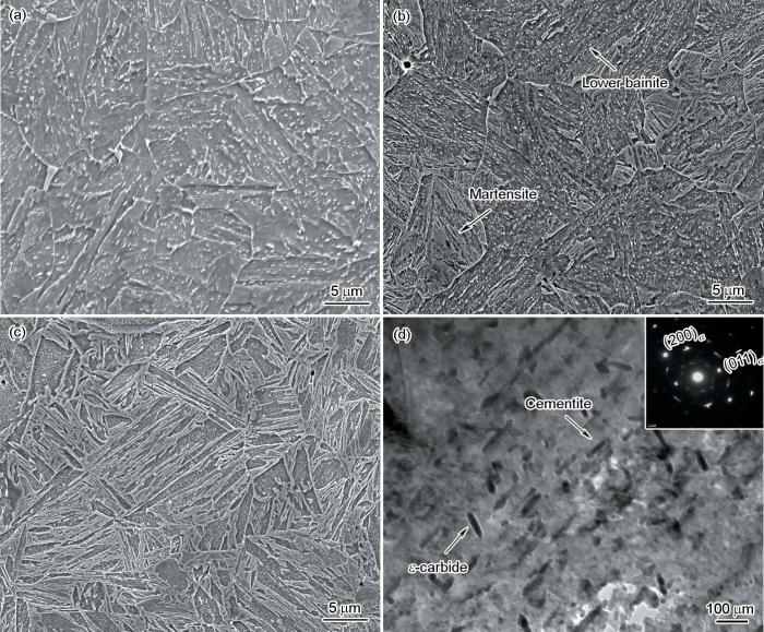 SEM images of 100%LB (a), LB/M (56%M + 44%LB) (b), and 100%M (c) samples; and TEM image and selected area electron diffractin (SAED) pattern (inset) of the auto-tempered carbides within martensite in the LB/M microstructure, where the bright-field TEM image is from <001>α beam direction (Cementite and ε-carbide particles are along <011>α and <001>α, respectively) (d)